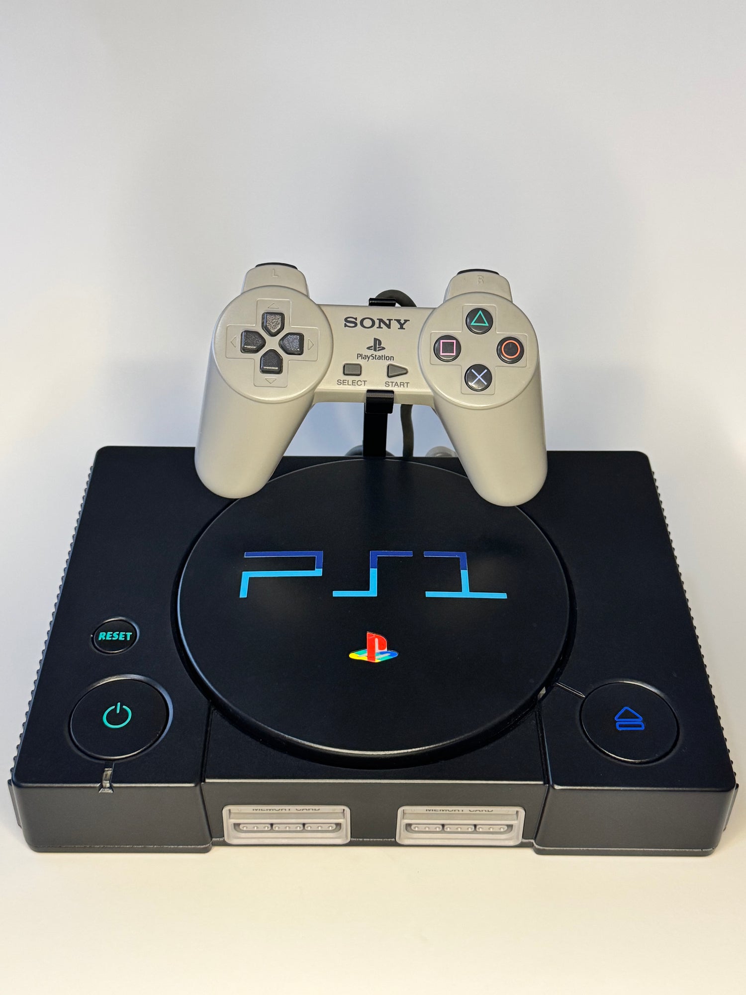 We wanted to do something special to celebrate our introductory release, and here it is. A PS2 themed PS1. It comes with a unique stand display to show off this unique retro console. It is fully functional in case you’re ever in the mood for some old school classics.